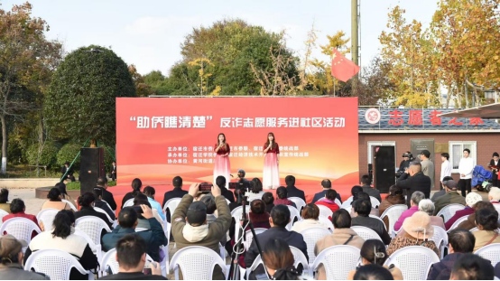 在演出开始前,大学生志愿者们为现场侨眷、社区朋友分发反诈宣传手册,并为他们详细讲解当下诈骗的主要方式,与他们分享反诈心得。