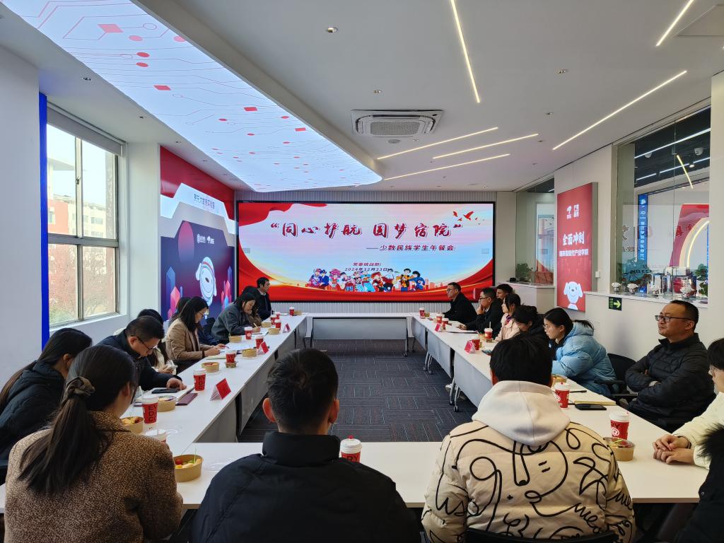 为深入贯彻落实习近平总书记关于加强和改进民族工作的重要思想,深化民族团结进步教育,助力少数民族学生更好成长。12月23日中午,统战部在京东产教融合基地二楼会议室举办“同心护航 圆梦宿院”少数民族学生午餐会,党委常委、统战部部长陆海霞出席会议并讲话,校团委书记许春雷、学工处副处长张见、教务处副处长蒋连接、经济管理学院党委副书记沈姣、机电工程学院协助负责学生工作乔心阳和15名少数民族学生代表参加会议,会议由党委统战部常务副部长刘苏敏主持。