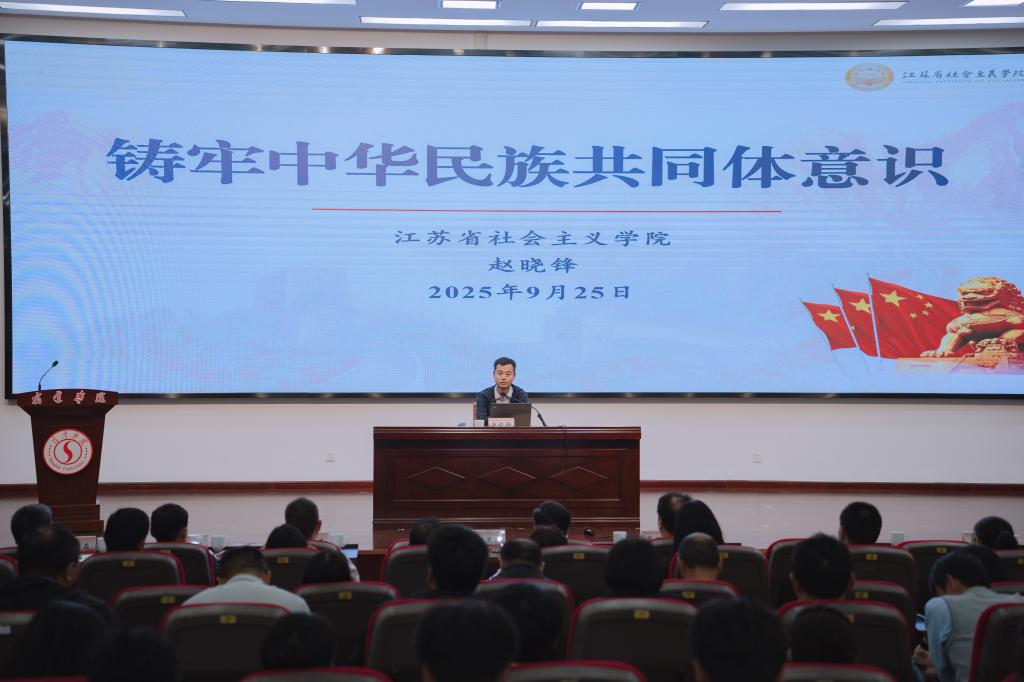 省社会主义学院教研室副主任、副研究员赵晓锋以《铸牢中华民族共同体意识》为题作专题宣讲,从破除模糊认识和错误观点为切入点,从地理、政治、文化、经济、民族等多维角度解读中华民族共同体,解答“怎么看”的认知问题,之后宣讲围绕如何做好高校民族宗教工作提供了“怎么办”的行动指南。