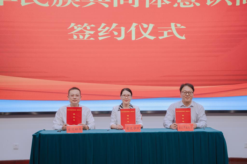 启动仪式上,宿迁学院马克思主义学院教师邵焕举以《坚持“两个结合” 铸牢中华民族共同体意识》为主题开展思政微课分享;教师教育学院学生何紫涵围绕《“语润入宁 师心筑梦” 一字一句普通话 同心同向民族魂》进行社会实践分享。分享环节后,宿迁学院、宿迁开放大学、宿迁幼师三方共同签署“铸牢中华民族共同体意识高校联盟”倡议书,并携手为“铸牢中华民族共同体意识・高校在行动 宿迁高校联盟”揭牌,标志着宿迁高校在民族团结工作领域的协同合作正式启动。